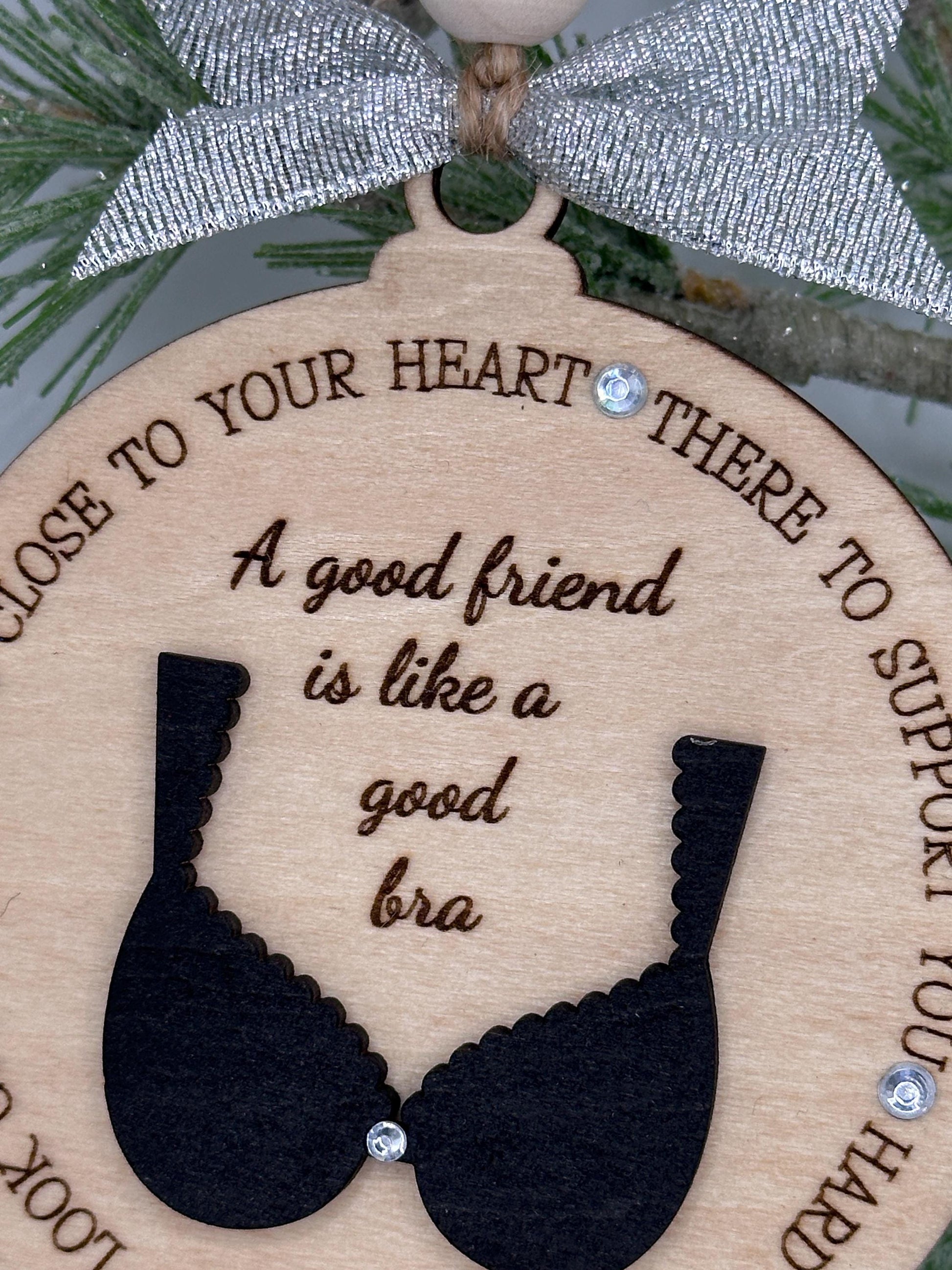Funny Friendship Bra Ornament, Holiday Keepsake Gift for Bestie, Wood Ornament for Friends, Best Friend Gifts