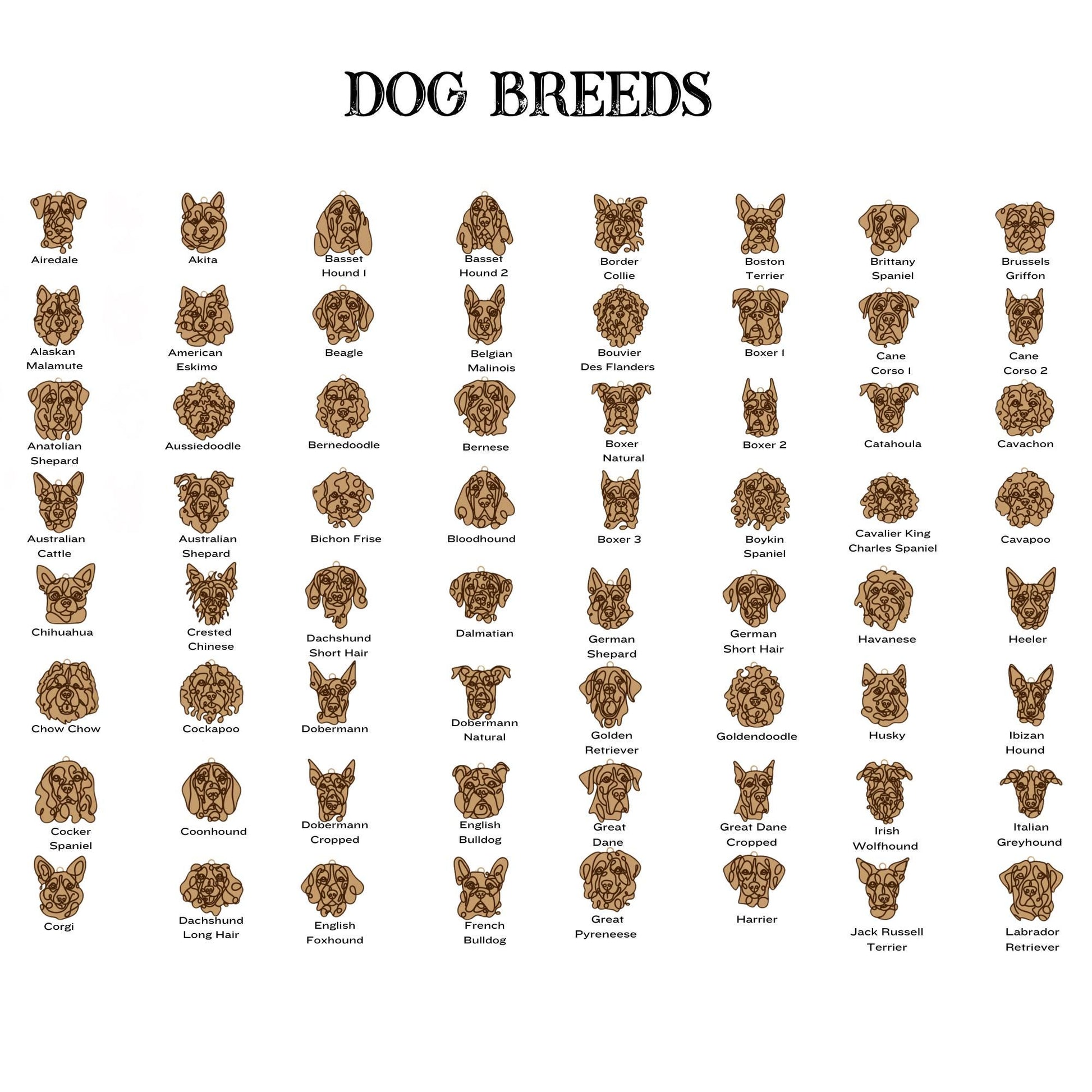 More than 100 dogs are available. See the picture guide for a line drawing of each breed. If you don't see your breed, please message me; I may have more options available then!